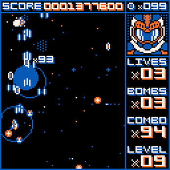 - Bomb (B): Bombs will clear all enemies and their projectiles on the screen., awarding additional points for each enemy and projectile cleared. You start with 3 bombs.